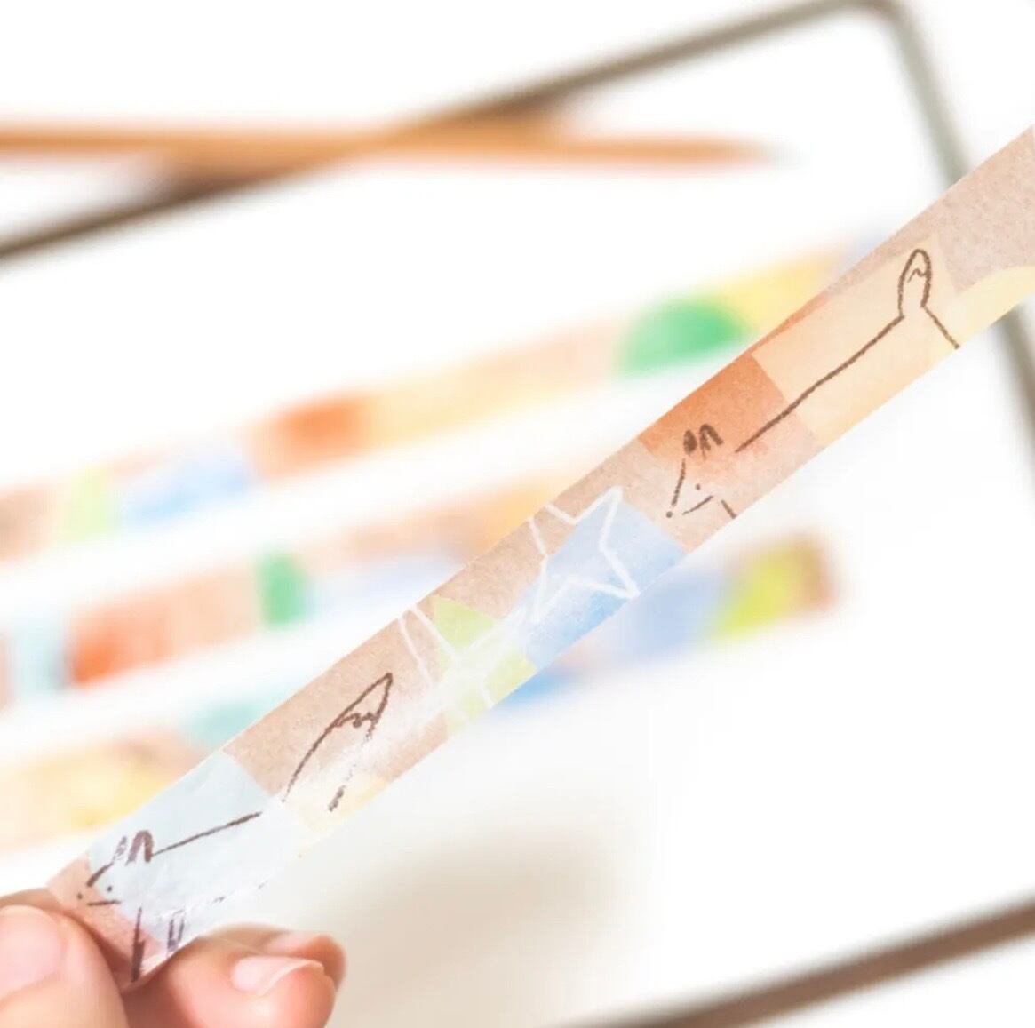 カラフルなテープの上に線画のきつねのイラストがかわいいです。