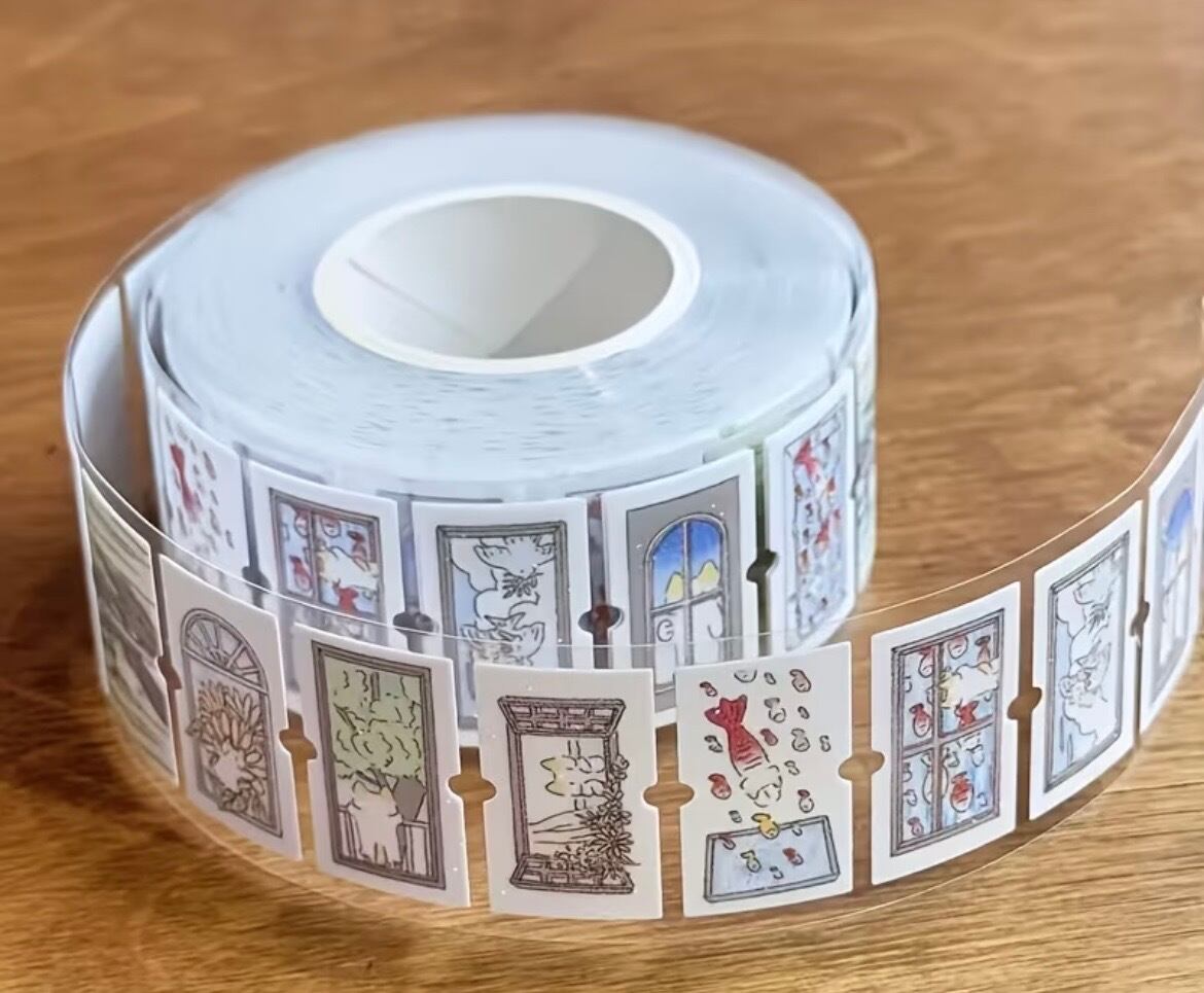 ねこと窓の柄がかわいいラベラーロールシールです。